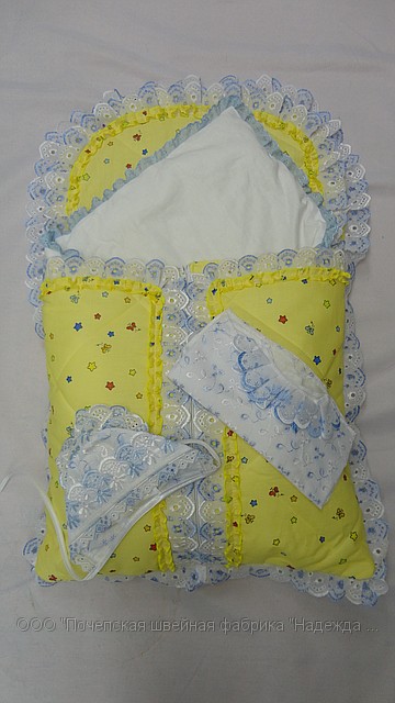 В конверт входит: сам конверт (хлопок -100 %, наполнитель - холофайбер), одеяло (хлопок -100 %, наполнитель - холофайбер), распашонка (хлопок - 100%), чепчик.