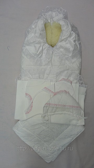 Комплектация: конверт, одеяло, пеленка, распашонка, чепчик легкий, чепчик теплый, уголок.